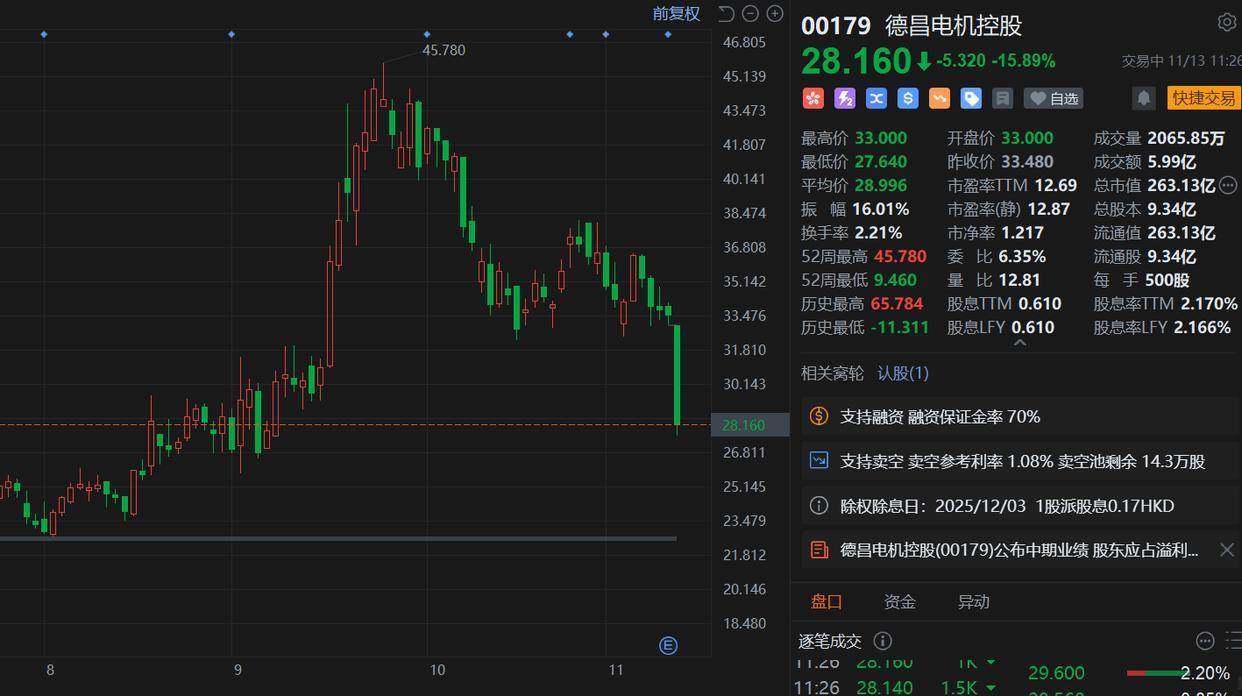 德昌电机(0179.HK)大幅下跌超16%,报28.16港元创逾3个月新低,月内累计跌幅超22%,总市值264亿港元。消息上,德昌电机控股公布截至2025年9月30日止六个月中期业绩,营业额为18.33亿美元,同比下跌1%。股东应占溢利净额上升 3%至1.33亿美元,每股摊薄盈利14.21美仙,中期股息每股17港仙。小摩报告指,公司于财报简报会中对新业务计划仍仅提供极有限细节,延续其一贯的沟通风格。在缺乏更多关于AIDC及机器人订单进度的披露下,预期对该股市场情绪将维持冷淡,认为任何关于这些业务渠道的具体更新皆可能触发显著的估值重估。目标价由67港元降至54港元,评级“增持”。